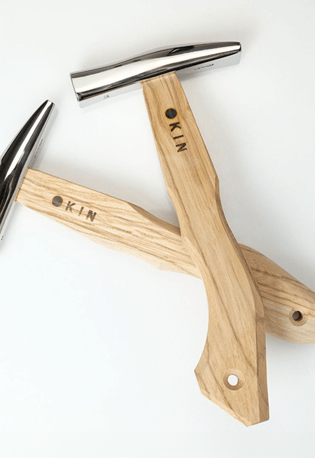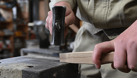 狭所作業や、かがんだ際に腰道具に差したハンマーが床を傷つけるといった悩みを解決するために生まれた、全長250mmの「国産樫木柄ショートハンマー」。
