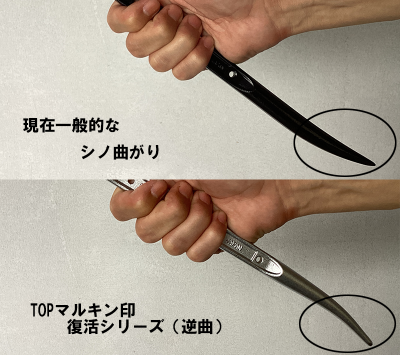 シノの曲がり方は20~30年前まで今の主流とは逆に曲がっている商品が一般的でした。(現在では逆曲といいます。)マルキン印では昔からの馴染があるラチェットを制作してほしいという声を受けて、「復活」と名付けこの逆曲のラチェットを制作しました。3種のカラー展開(メッキ、ブラック、銀総磨)もしておりますので是非ネットショップからご購入ください。