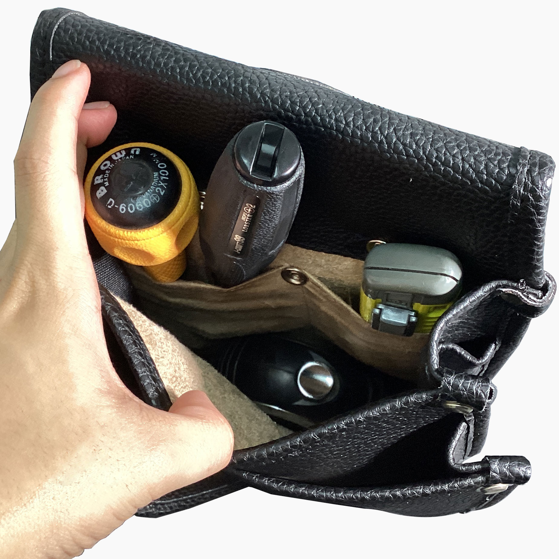 本商品は人工スウェードと人工皮革を使用しており、天然皮革に比べて耐水性が高く、内と外にポケットが2つずつと大きなコンベックスや工具もたっぷり入る収納量になっています。