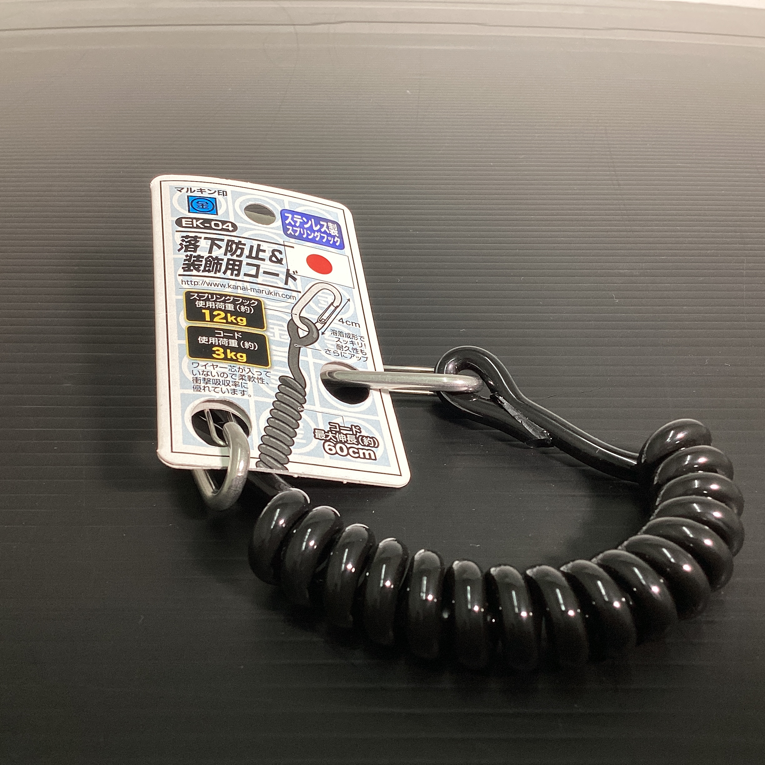 今回ご紹介するのはマルキン印 落下防止&装飾用コード EK-04です。マルキン印の落下防止&装飾用コードは現在までに6種展開されていますが唯一黒のポリウレタン製コードを使用して柔軟性に優れた商品となっております。
