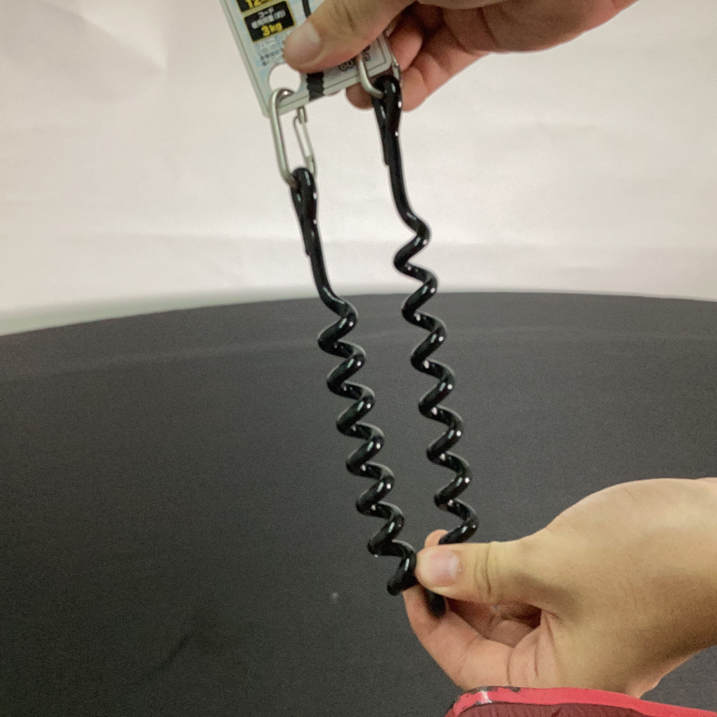 使用荷重3kgのポリウレタン製コードの両端に使用荷重12kgのスプリングフックを付けました。ワイヤー芯が入っていないため柔軟性、衝撃吸収性に優れております。
