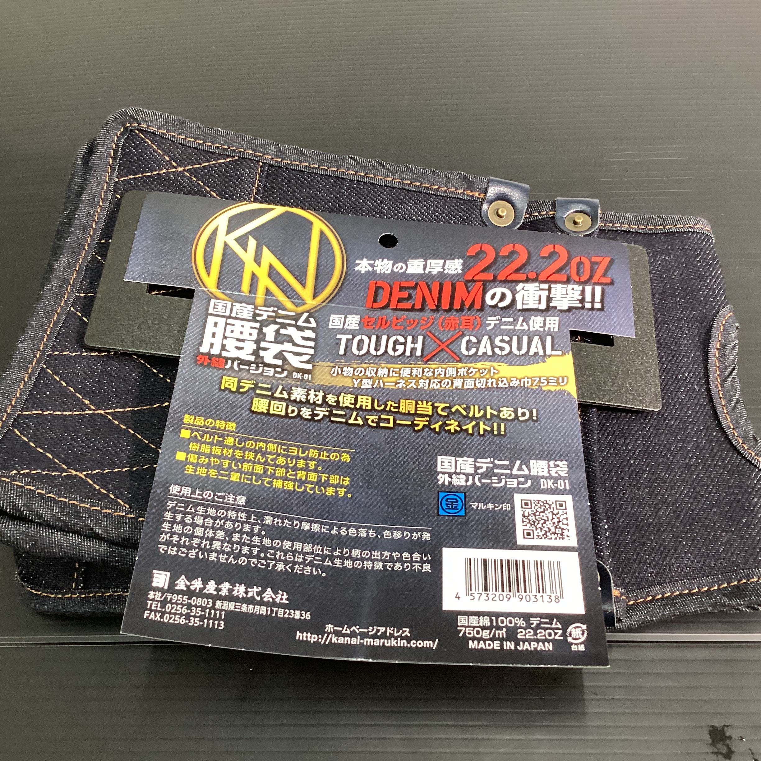 マルキン印でもそんなお客様の声に応えたいという思いから本商品が制作され、現在は他腰袋商品にも負けないほどの人気を博しています。セルビッジをあしらった国産デニム22.2オンス生地はジーンズの中でも厚く、耐久性に優れていて、手に持つとずっしりと重厚感があります。