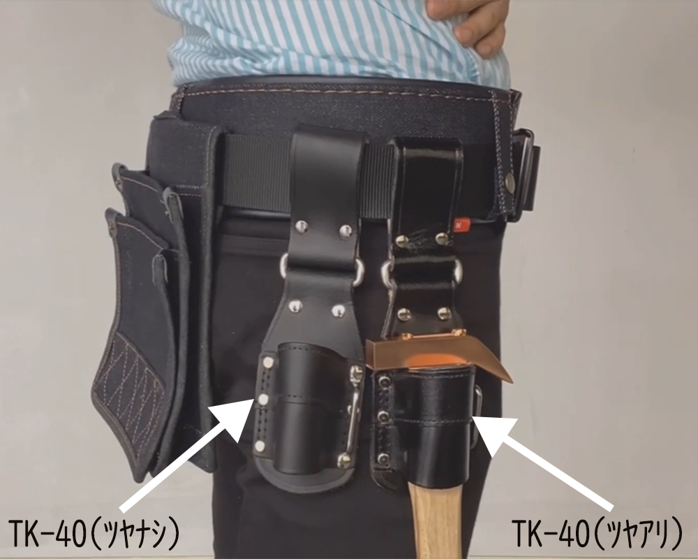 こちらの商品は2023年6月にツヤありモデルと共に販売開始されました。TK-40はグリップエンド(柄尻)が大きいハンマーも入りやすく、丈夫な極太角ステンリングにより体にフィットするような構造になっています。長時間腰から下げていても疲れないよう、素材には牛の床皮を使用して安全コードを掛けられるようにステンストラップも付けたまさにマルキン印がなせるこだわりの商品です。