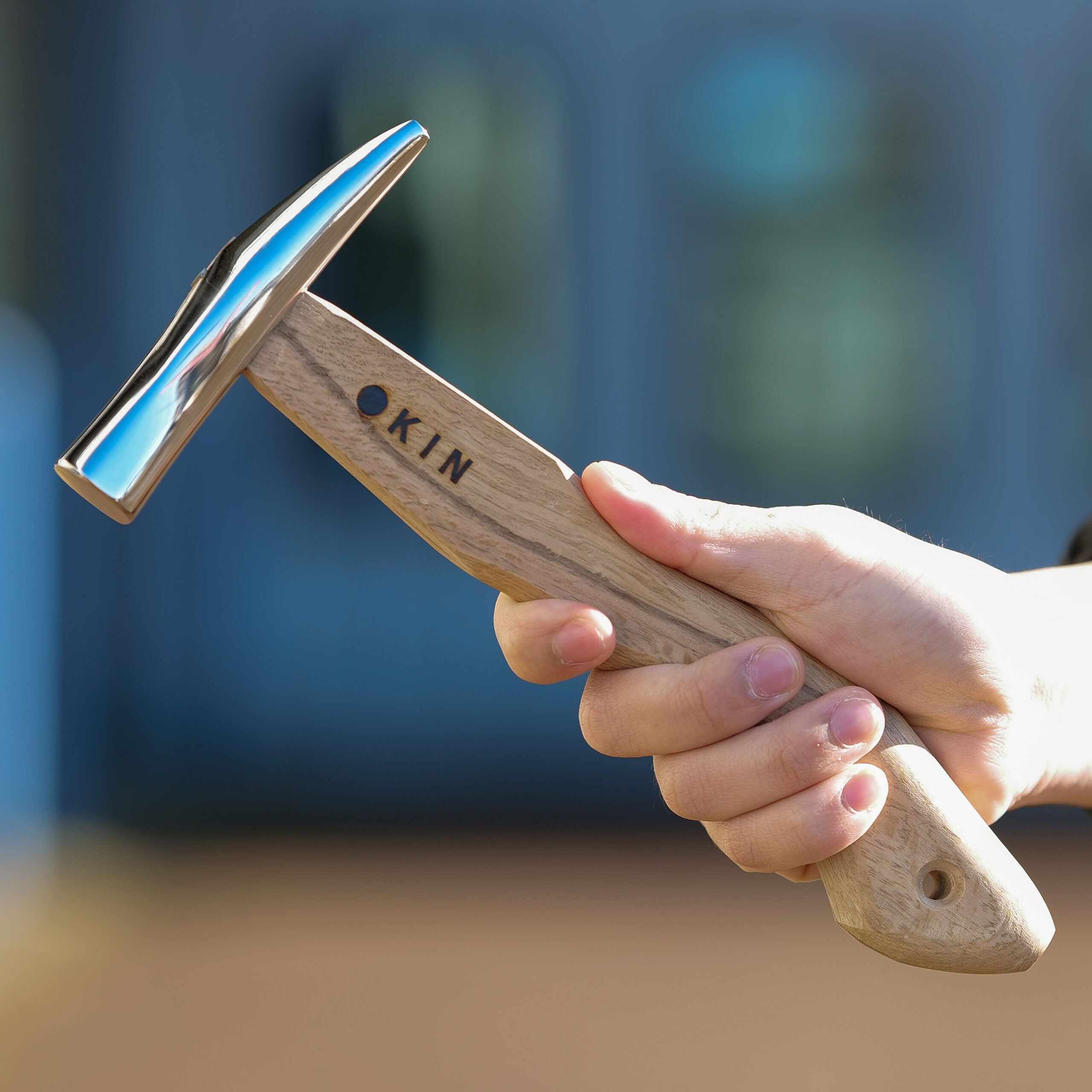 ハンマーのストレート柄をくびれた形状に先加工し、振り下ろす際に力が逃げにくいようオリジナルの蛇のように波打つ持ち手を設計。250mmの短さから腰を曲げる作業時に姿勢を選ばず、利便性と共にその革新的なデザインを評価いただきました。