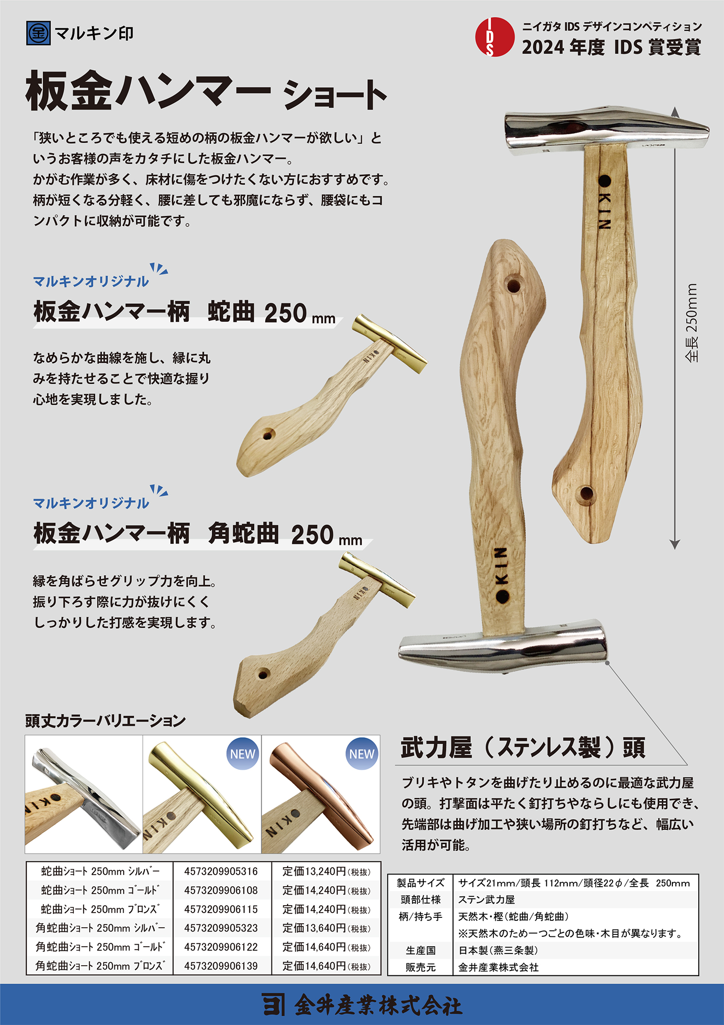 マルキン印の新商品6月24日 2024.06.24 お知らせ新規取扱品マルキン印 6月24日より板金ハンマーにシリーズに新色が登場!金井産業 マルキン印 板金ハンマー ステン武力屋 21 250M/M ゴールド/ブロンズ PDFをダウンロード ご購入はこちらから 板金ハンマー ステン武力屋21 蛇曲ショート 250M/M ゴールド Yahoo!shopから購入BASESHOPから購入 板金ハンマー ステン武力屋21 角蛇曲ショート 250M/M ゴールド Yahoo!shopから購入BASESHOPから購入 板金ハンマー ステン武力屋21 蛇曲ショート 250M/M ブロンズ Yahoo!shopから購入BASESHOPから購入 板金ハンマー ステン武力屋21 角蛇曲ショート 250M/M ブロンズ Yahoo!shopから購入BASESHOPから購入