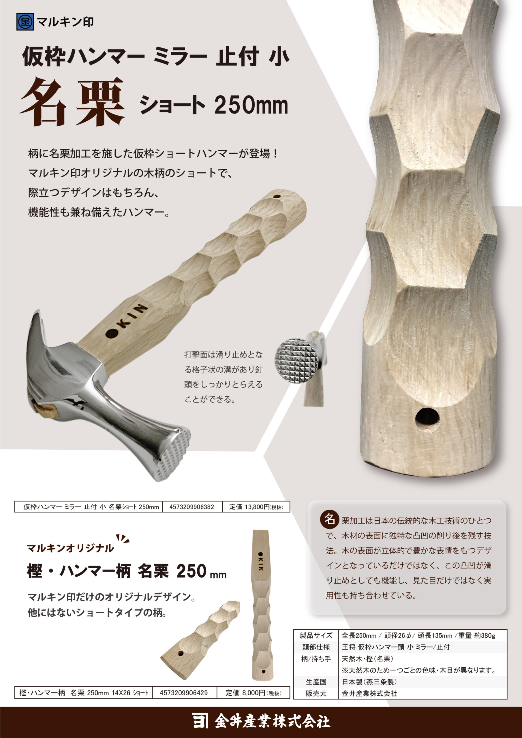 マルキン印の新商品12月17日 2024.12.17 お知らせ新規取扱品マルキン印 12月17日よりマルキン印の仮枠ハンマーシリーズに名栗柄が登場! マルキン印 仮枠ハンマー ミラー 止付 小 名栗ショート250mm PDFをダウンロード ご購入はこちらから マルキン印仮枠ハンマー ミラー 止付 小 名栗ショート 250mm Yahoo!shopから購入BASESHOPから購入 マルキン印 樫・ハンマー柄 名栗 250mm 14X26 ショート Yahoo!shopから購入BASESHOPから購入