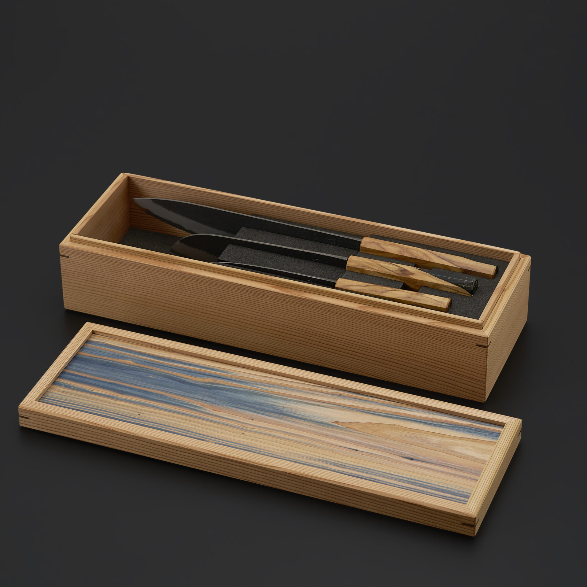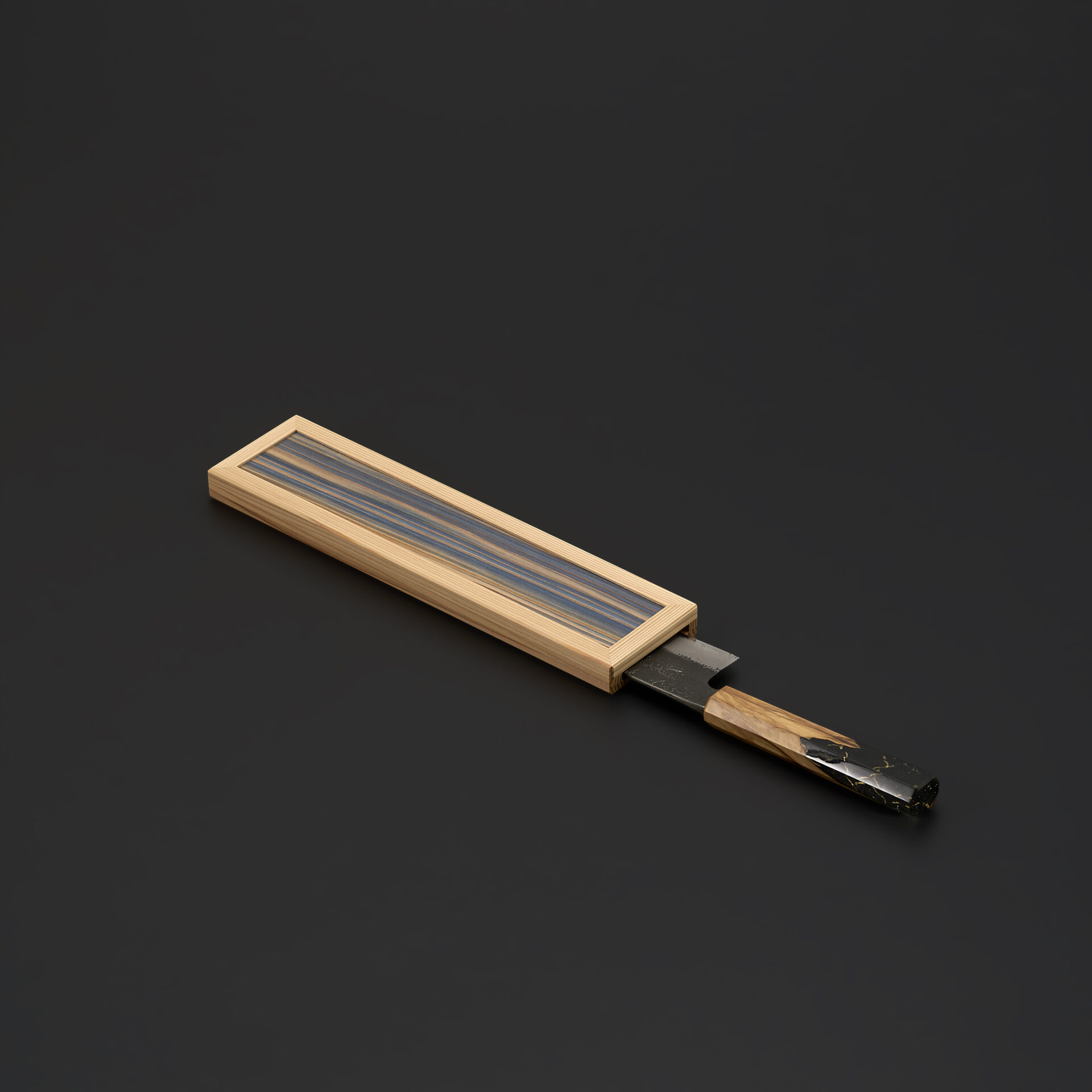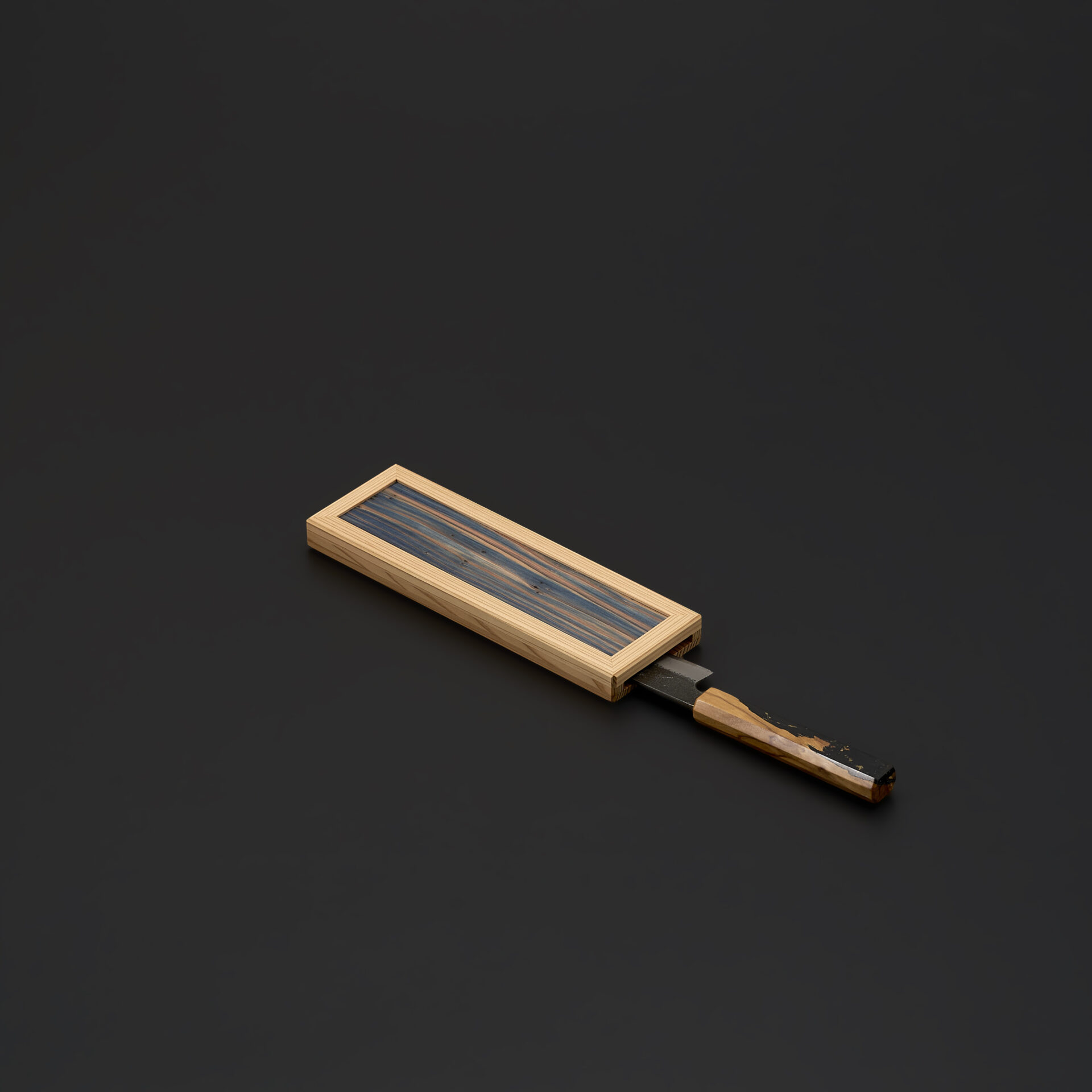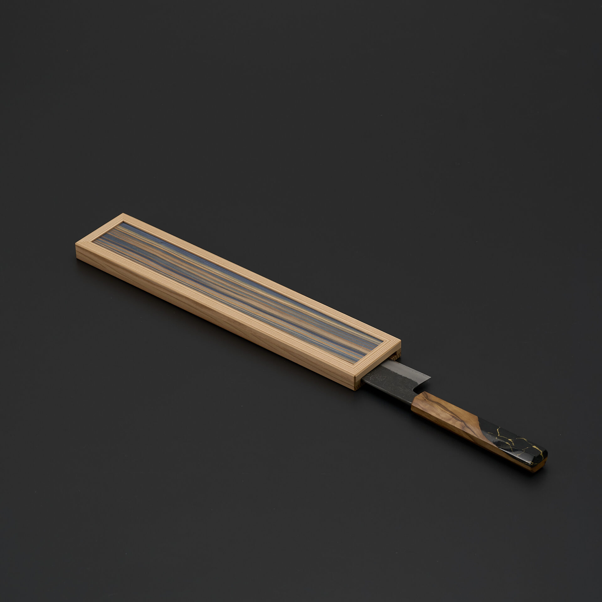 天然木の突板をあしらった、包丁入れ・包丁鞘です。木目の流れを活かした端正な意匠が、包丁の美しさを静かに引き立てます。直線的て凛としたフォルムの中に、突板ならではの繊細な木理が映え、控えめでありながら確かな存在感を放ちます。木目の表情を活かした端正な佇まいが、包丁の存在感を静かに引き立てます。