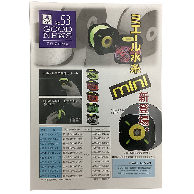 たくみミエール水糸minimini 07 – 測位・測量関係07-04-水糸07-04-水糸_たくみ 製品説明 仕様 ※商品はサイズ等に多少差異がある場合があります。※ご使用のモニター環境により、実際の商品との色合いが異なって見える場合があります。 ※製品の仕様・パッケージ等は予告なく変更する場合がありますので、ご了承ください。 商品仕様 mini メーカー たくみ