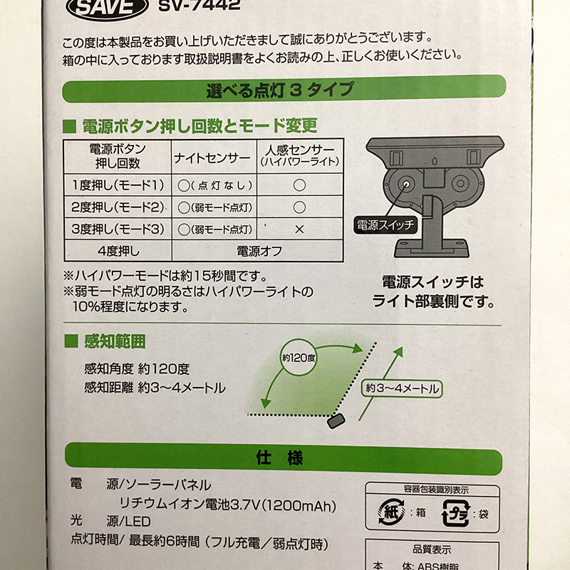 セーブ・インダストリーソーラー式ガーデンライトSV-7442 12 – ライト関係12-08-イルミネーション・センサーライト12-08-イルミネーション・センサーライト_SAVE(セーブ・インダストリー) 製品説明 仕様 ※商品はサイズ等に多少差異がある場合があります。※ご使用のモニター環境により、実際の商品との色合いが異なって見える場合があります。 ※製品の仕様・パッケージ等は予告なく変更する場合がありますので、ご了承ください。 商品仕様 SV-7442 メーカー セーブ・インダストリー
