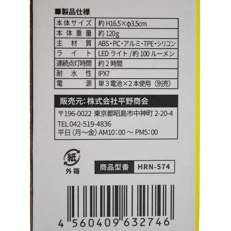 平野商会耐衝撃・防水ハンディライトHRN-574 12 – ライト関係12-04-ハンドライト12-04-ハンドライト_平野商会 製品説明 仕様 ※商品はサイズ等に多少差異がある場合があります。※ご使用のモニター環境により、実際の商品との色合いが異なって見える場合があります。 ※製品の仕様・パッケージ等は予告なく変更する場合がありますので、ご了承ください。 商品仕様 HRN-574 メーカー 平野商会