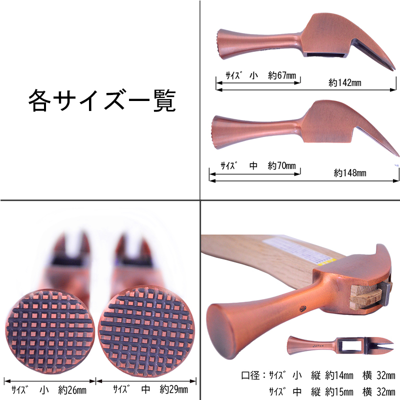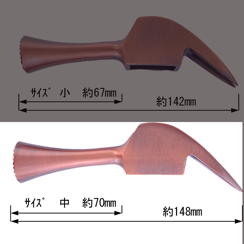 仮枠作業が必要になる様々なシーンで扱いやすいよう頭部はやや長いラッパな形状で、片側が打撃部、もう片側が釘抜き部となっています。