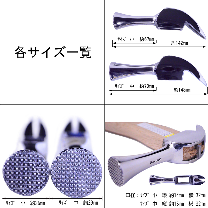 仮枠作業が必要になる様々なシーンで扱いやすいよう頭部はやや長いラッパな形状で、片側が打撃部、もう片側が釘抜き部となっています。