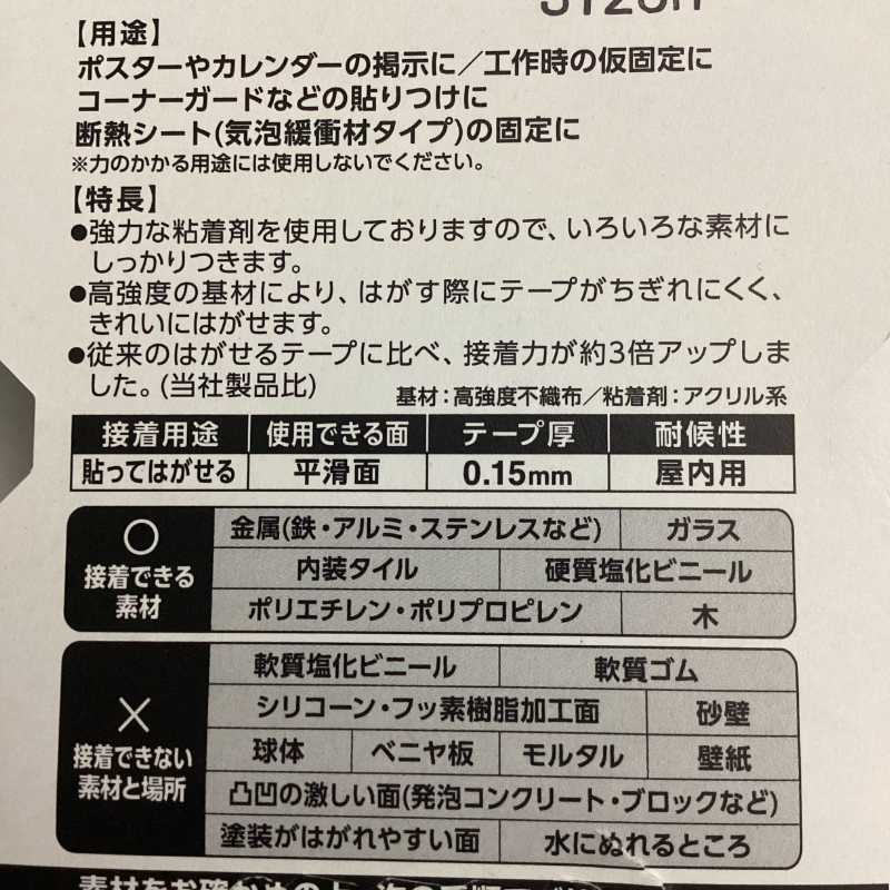 3M(Scotch)はがせる両面テープ 強力薄手KRE-19 07 – 測位・測量関係07-09-テープ・養生07-09-テープ・養生_3M(Scotch) 製品説明 仕様 ※商品はサイズ等に多少差異がある場合があります。※ご使用のモニター環境により、実際の商品との色合いが異なって見える場合があります。 ※製品の仕様・パッケージ等は予告なく変更する場合がありますので、ご了承ください。 メーカー 3M(Scotch) 商品仕様 KRE-19